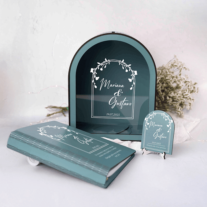 Um conjunto elegante e personalizado que marca o dia do casamento com charme e funcionalidade. Inspirado no formato de um marco de correio, este set inclui uma caixa para cartões de felicitação/ofertas e um livro de honra, ambos totalmente personalizáveis em design e cor. Ideal para recolher as mensagens dos convidados e registar memórias inesquecíveis. A frente em acrílico destaca os nomes e a data do casamento com um acabamento premium. Como oferta, incluímos uma placa de agradecimento ou sinal de boas-vindas a condizer.