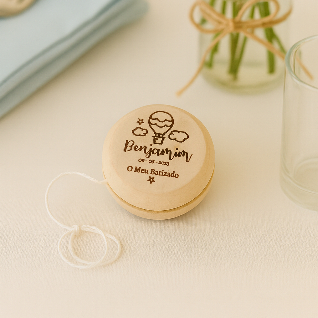 Uma lembrança original e divertida para marcar um dia especial! Este Yo-Yo em madeira natural é polido com acabamento suave, perfeito para oferecer como recordação num batizado, comunhão ou aniversário infantil. A gravação personalizada com o nome e data da cerimónia transforma este pequeno brinquedo num símbolo cheio de ternura e memórias.